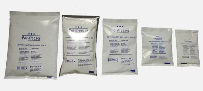 El gel Polyfreezer se presenta en bolsas de polietileno de 140 micrones, blancas, empacados en caja de cartón corrugado.